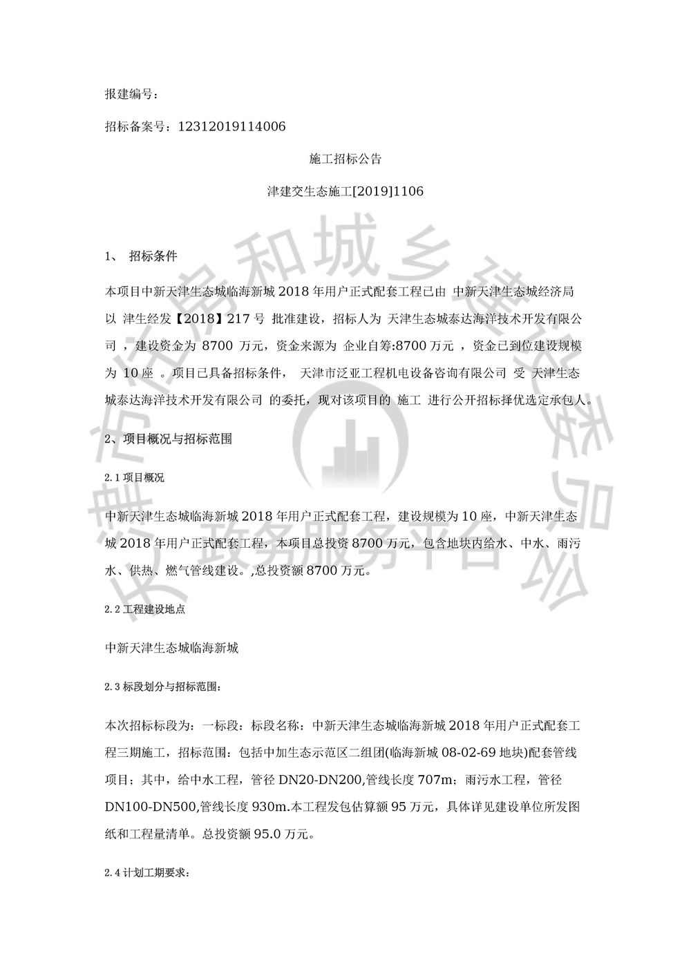 中新天津生态城临海新城2018年用户正式配套工程三期施工招标公告