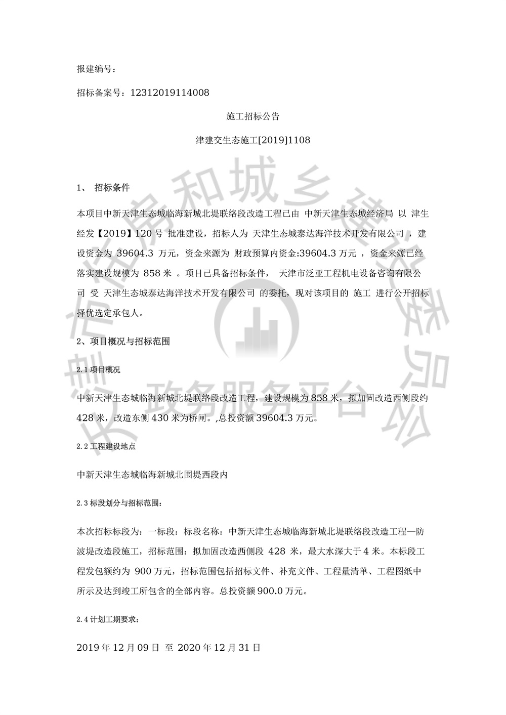 中新天津生态城临海新城北堤联络段改造工程—防波堤改造段施工招标公告