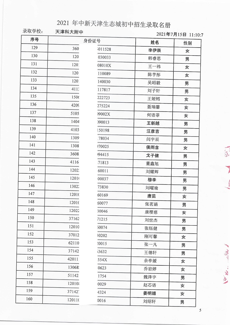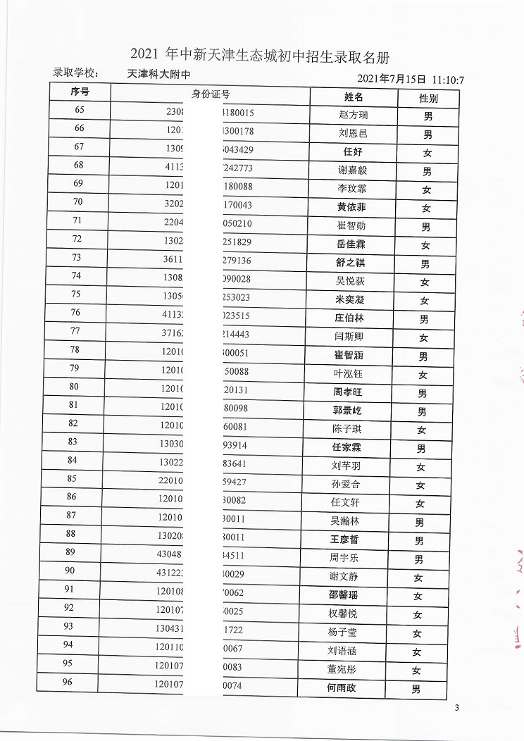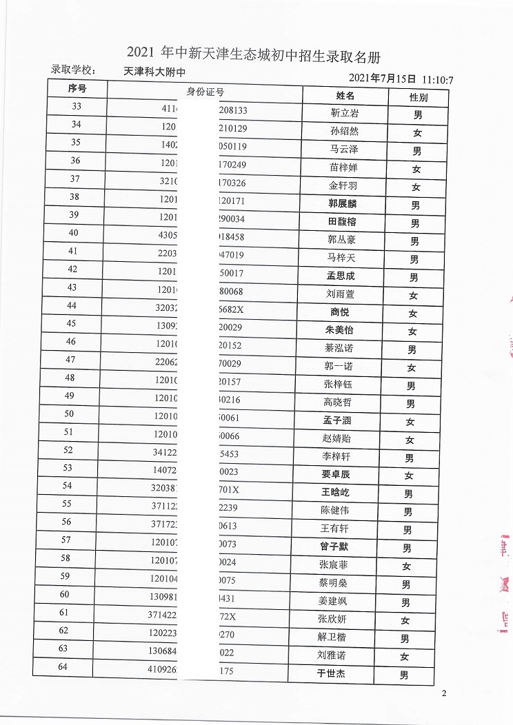 天津科技大学附属中学7年级录取名单